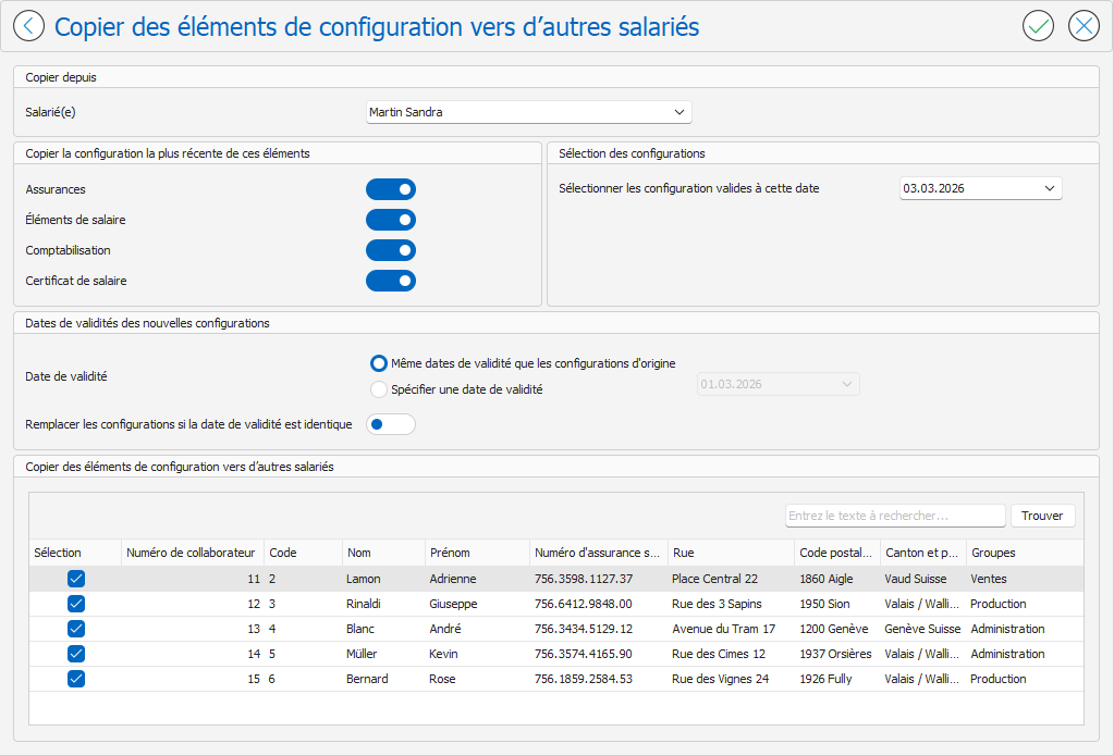 La duplication de configuration permet d’uniformiser rapidement les paramètres de salaire entre collaborateurs. Vous pouvez copier en une seule opération les assurances, éléments de salaire, comptabilisation et certificat de salaire d’un salarié de référence vers plusieurs autres.