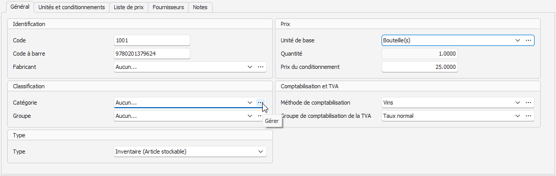 - Depuis l'onglet Général de la page Articles (menu Stock, Articles, ouvrez l'article concerné), cliquez sur le bouton Gérer, représenté par trois petits points … à droite de la liste déroulante Catégorie: