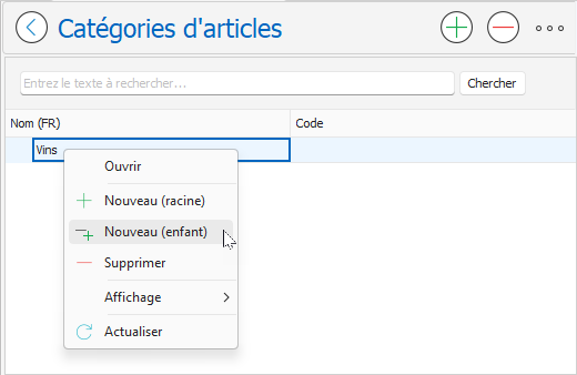 - Faites un clic droit sur la catégorie racine concernée dans la page Catégories d’articles, puis dans le menu contextuel, sélectionnez Nouveau (enfant):