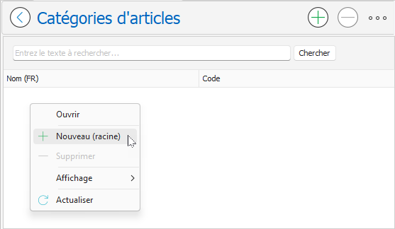 - Vous pouvez également cliquer sur le bouton Plus représenté par les trois petits points … en haut à droite de la page Catégories d'articles, puis sélectionner l'option Nouveau (racine).