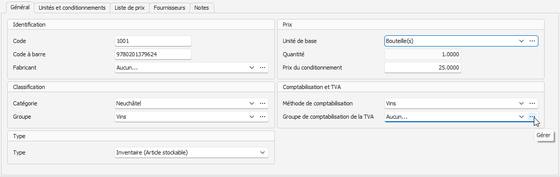 - Dans l’onglet Général, de la page Articles (menu Stock, Articles, ouvrez l'article), cliquez sur le bouton Gérer, représenté par trois petits points … à droite de la liste déroulante Groupe de comptabilisation de la TVA: