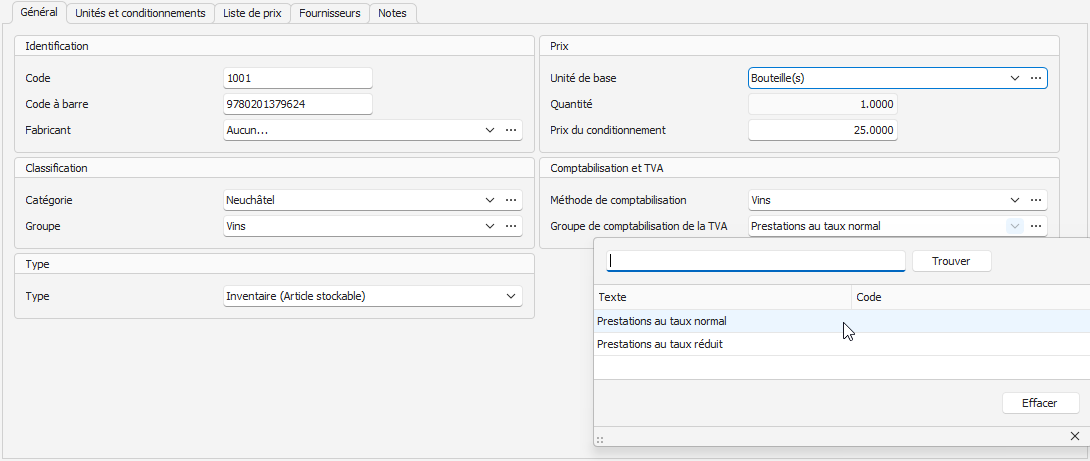 Dans l’onglet Général, de la page Articles (menu Stock, Articles, ouvrez l'article), sélectionnez le groupe de comptabilisation souhaité dans la liste Groupe de comptabilisation de la TVA: