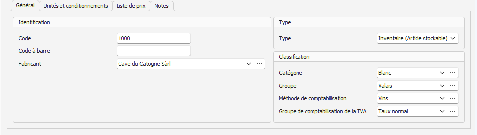 - Onglet Général: Identification, Classification, Type, Prix et Comptabilisation et TVA.