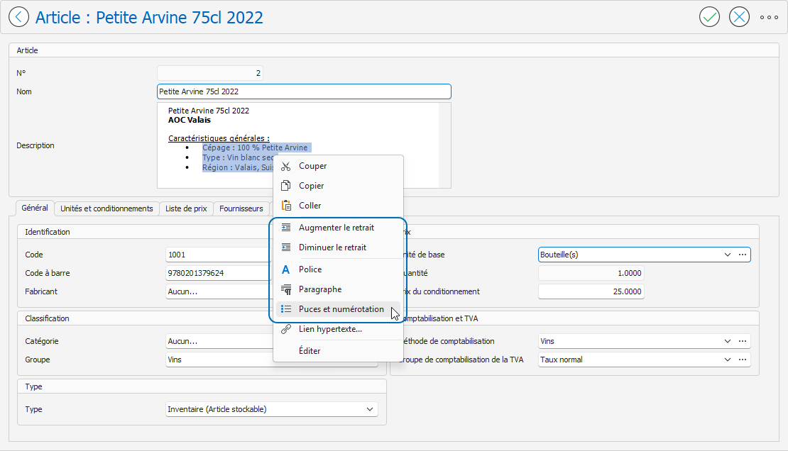 - Nom: Description courte de l'article, utilisée dans les sélections, recherches et certaines statistiques.