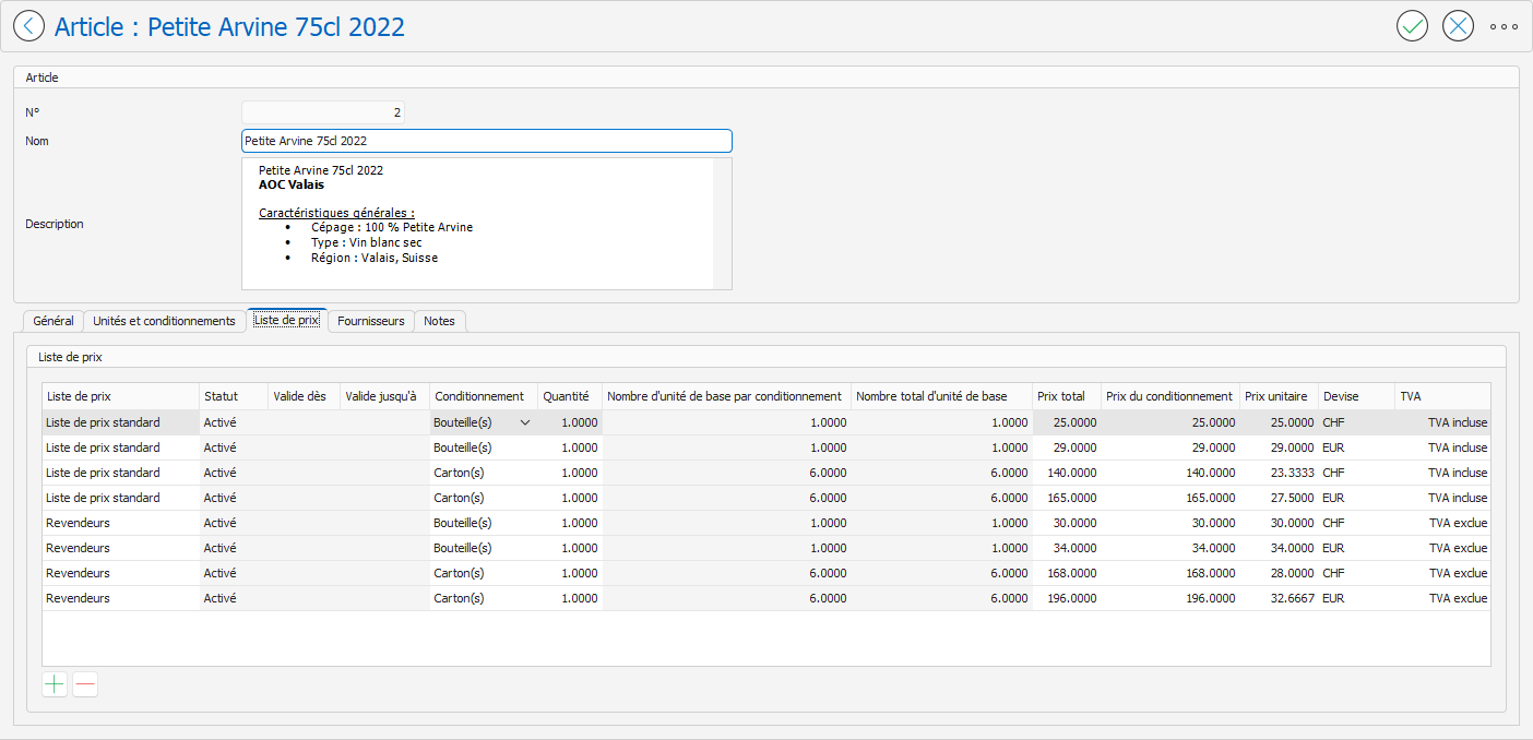 - Les dates de validité et le statut d’une liste de prix ne peuvent pas être modifiés directement depuis la fiche article.