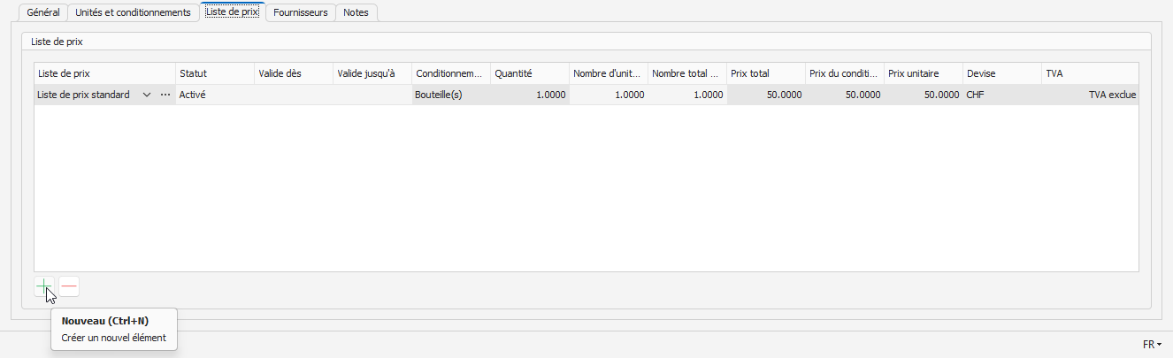 - Les champs Prix du conditionnement, Prix total et Prix unitaire sont liés. La saisie d’une valeur dans l’un de ces champs recalcule automatiquement les deux autres.